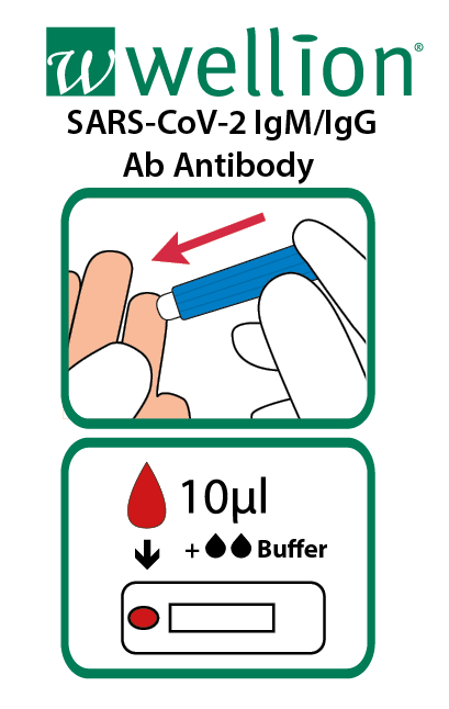 Der Wellion SARS-CoV-2 IgM/IgG Ab Antikörper Schnelltest dient dem Nachweis von IgM und IgG Antikörpern gegen Covid-19. Der Test wird mittels einer Vollblutprobe aus der Fingerbeere durchgeführt, mit nur 10 Mikrolitern Blut und in nur 15 Minuten wertet medizinisches Fachpersonal den Test aus. Der Test kann mobil und ganz ohne Laborgeräte durchgeführt werden.