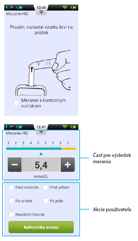 Patrí sem označenie výsledku testu glykémie, neplatný výber testu a tlačidlo “kalkulačky bolusu”.