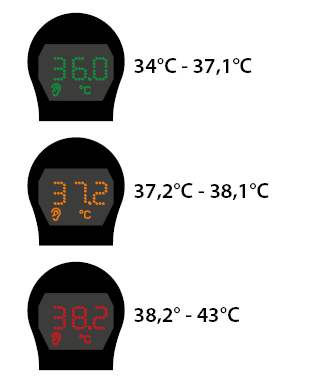- 34°C - 37,1°C, znamená, že telesná teplota je normálna. Je znázornená zeleným podsvietením.